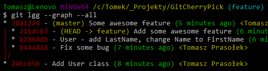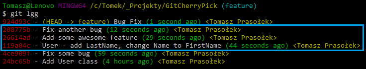 Przeniosły się tylko te 3 commity, które wybraliśmy. Commit o hashu 4ce909f został na branchu feature. Wszystko zadziałało tak jak chcieliśmy 🙂