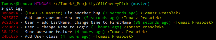 Przygotowałem sobie repozytorium z przykładowym projektem. Projekt zawiera tylko jedną klasę User, jest on bardzo prosty, bo chcę Ci tylko pokazać działanie polecenia cherry-pick.